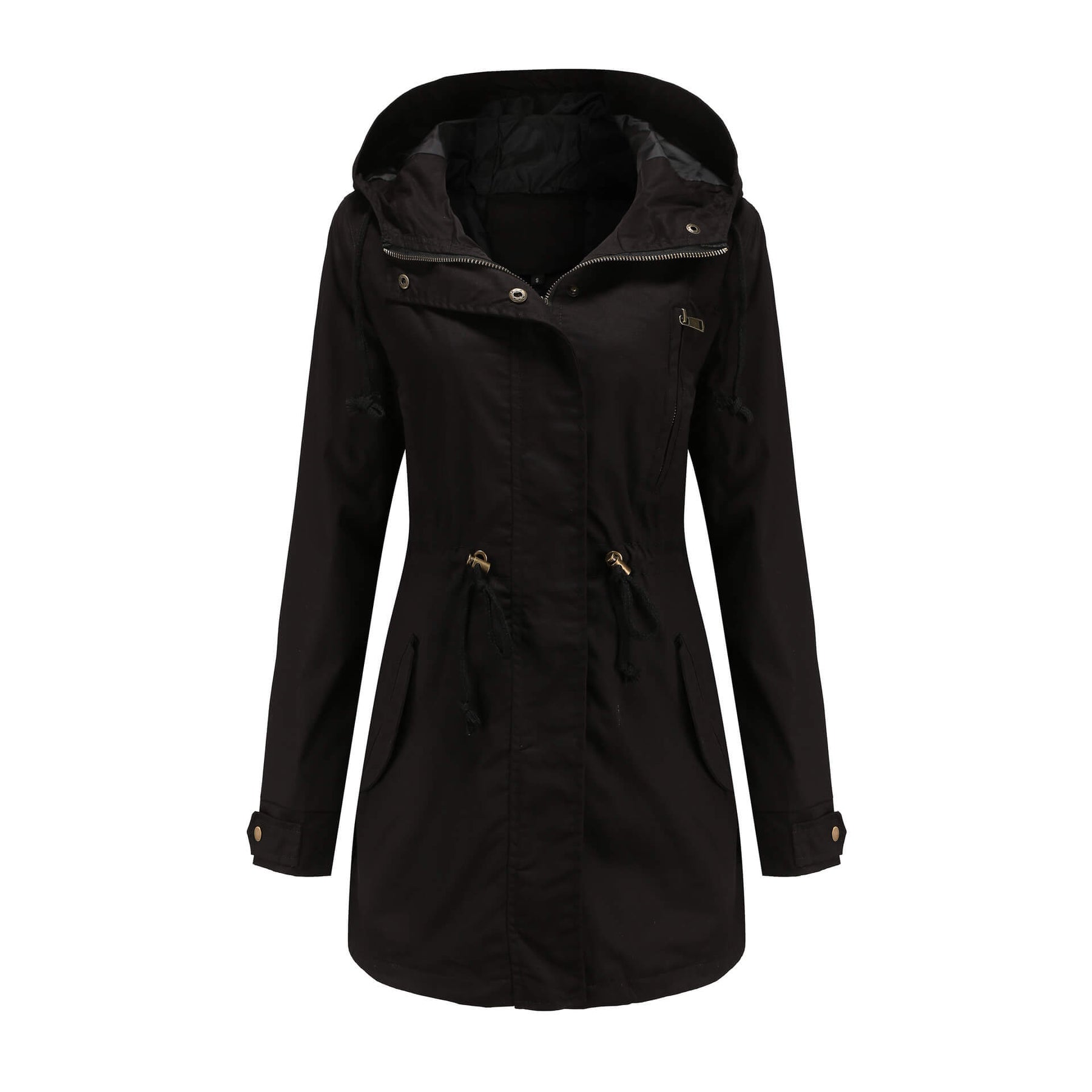 Deze dames winterjas heeft een langer model met een vaste capuchon die hoog aansluit en is uitgerust met aanpasbare koorden. Aan de voorzijde bevindt zich een doorlopende ritssluiting met een brede overslag, waardoor de lijnen van de vormgeving rustig en duidelijk zichtbaar blijven. De taille kan worden aangesnoerd voor extra nadruk op de vorm, terwijl de schuingepaatste zakken een praktische toevoeging vormen. Geschikt voor dagelijks gebruik, stadsbezoek en buitenmomenten.