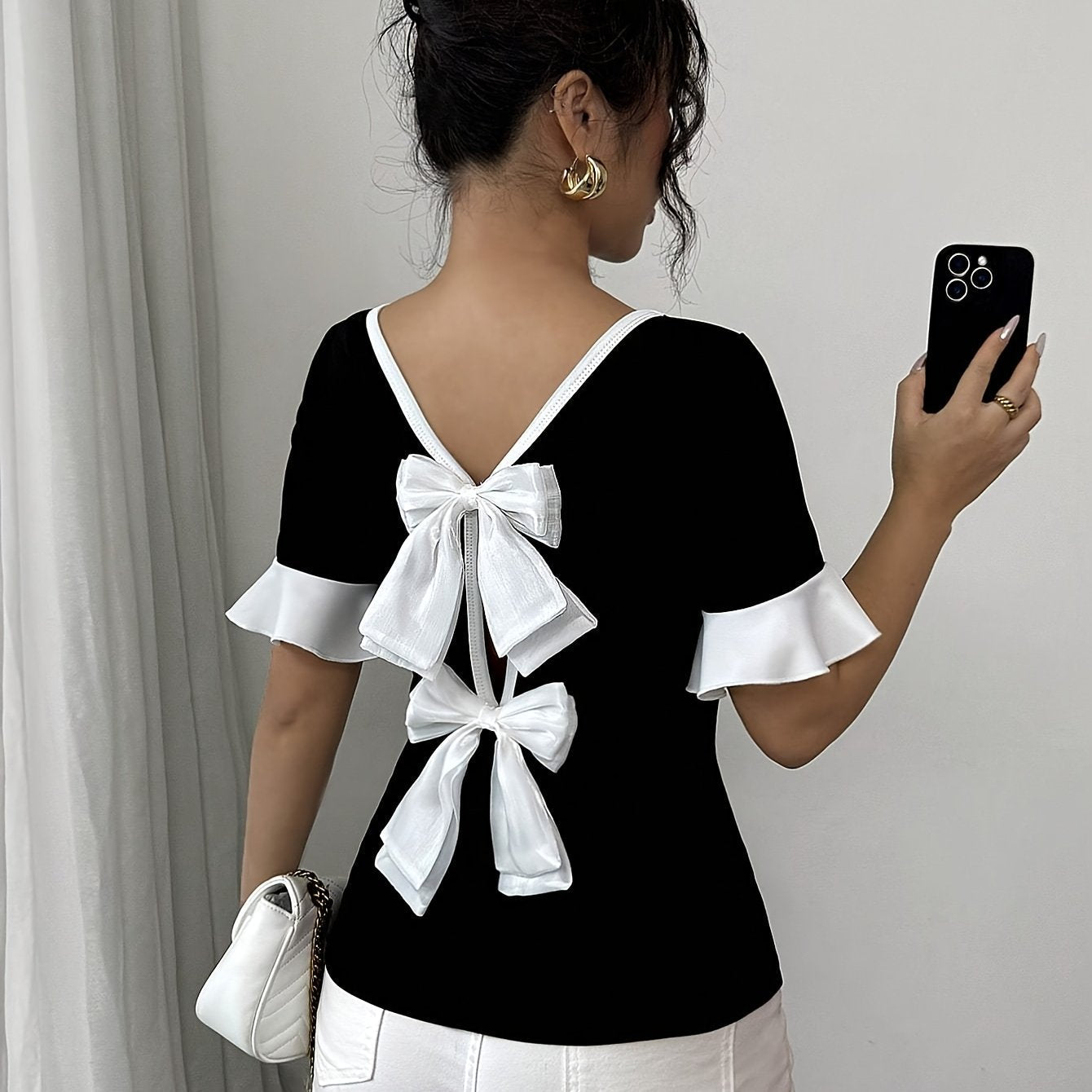 - Elegante Ontwerp: De klassieke zwart-witte kleurencombinatie met een uniek strikdetail op de rug voegt flair toe aan je outfit.