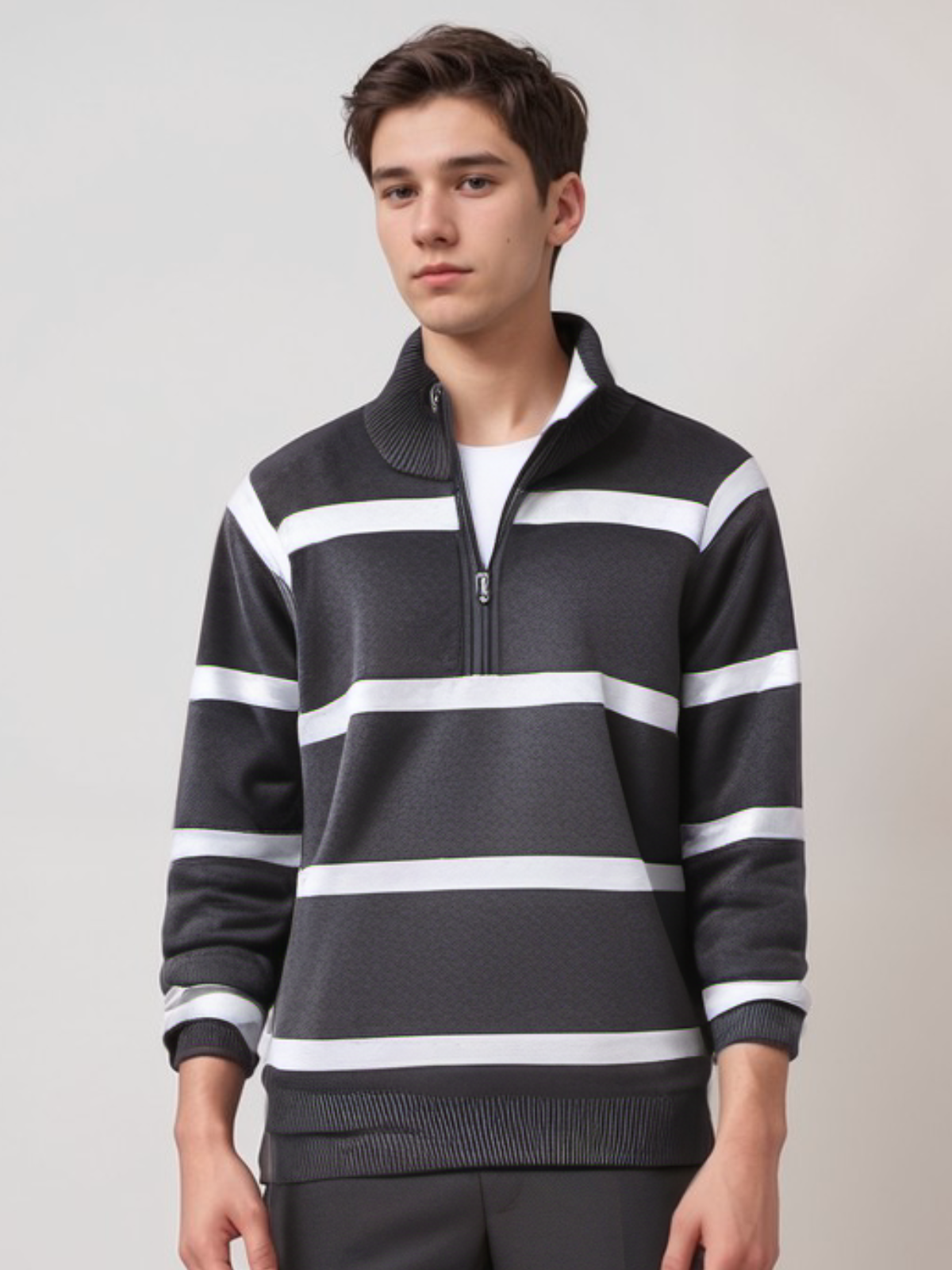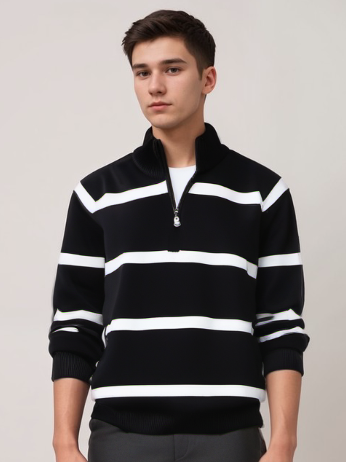 Deze gestreepte Joel-trui voor heren combineert casual elegantie met ultiem comfort. De opstaande kraag en praktische ritssluiting bieden een comfortabele pasvorm, ideaal voor ontspannen dagjes uit. Hij is gemakkelijk te combineren met verschillende looks, zodat je er altijd stijlvol en comfortabel uitziet.